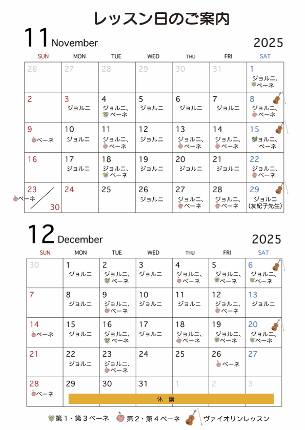 ⚫︎11月25日(火)は休講です。 ⚫︎12月24日(水)は休講です。 ⚫︎12月25日(木)は休講です。 ⚫︎12月27日(土)は休講です。 (振替レッスンは実施あり) ⚫︎12月29日(月)〜1月4日(日)は年末年始のため休講です。